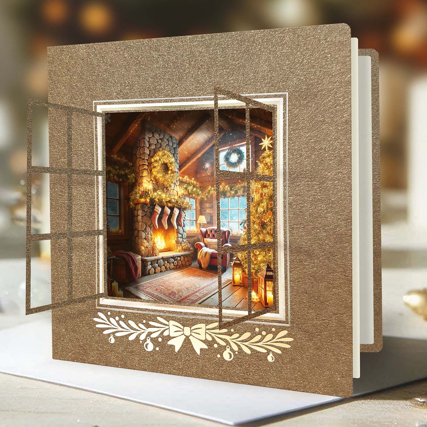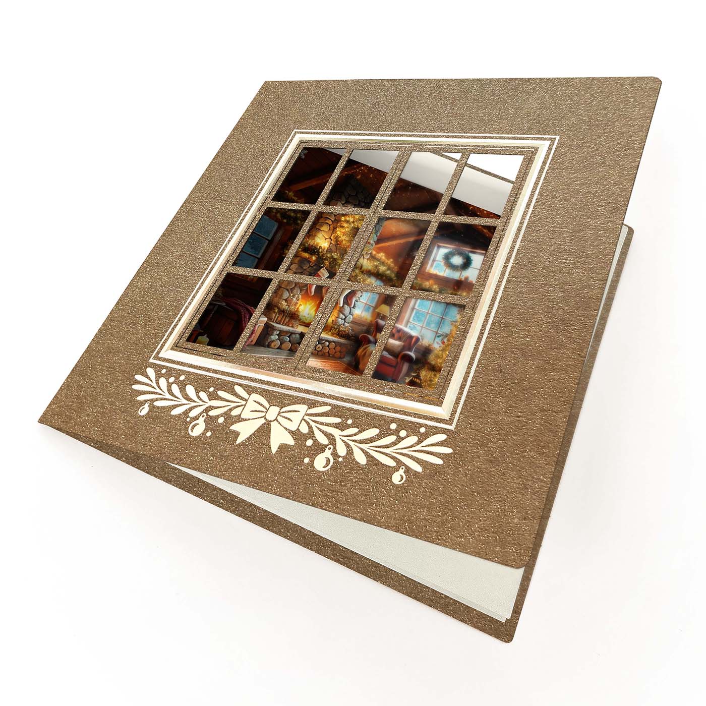Karácsonyi képeslap arany színű kreatív papírból, ablakos lézerrel vágott kivágással, ami mögül karácsonyi téli minta látszódik.