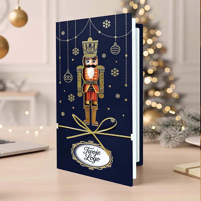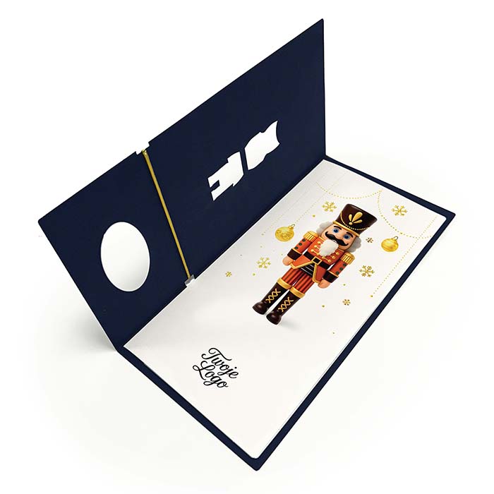 Kinyitható kék papírból készült karácsonyi képeslap , lézerrel vágott kivágás mögül kilátszik a színes ólomkatona minta, és a céges logo. Arany színű madzaggal van átkötve.