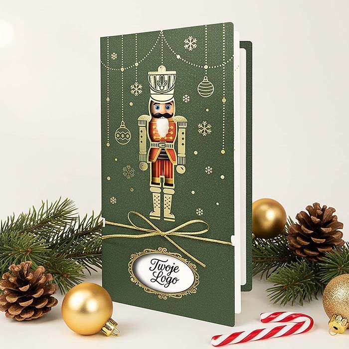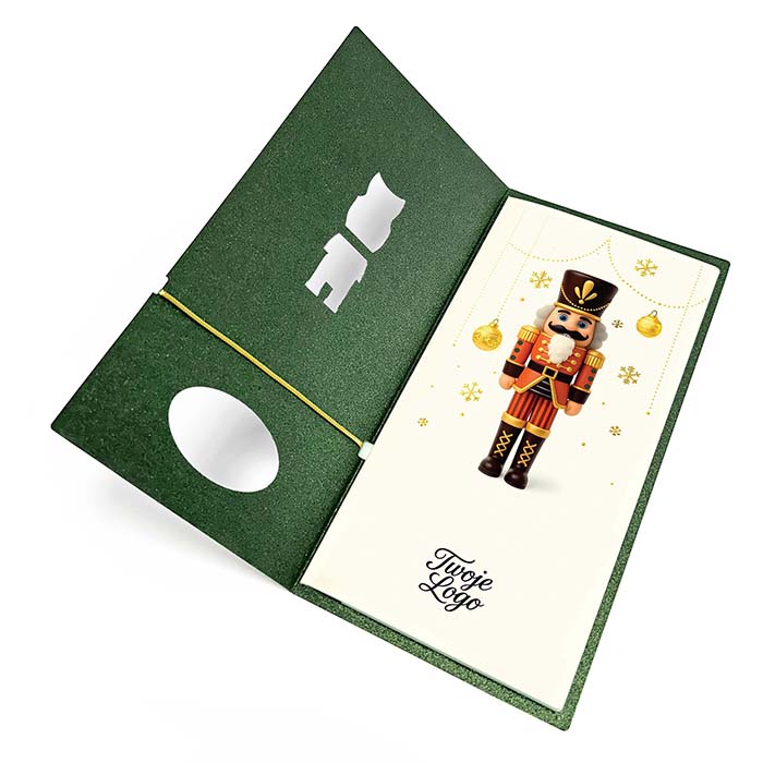 Kinyitható zöld papírból készült karácsonyi képeslap , lézerrel vágott kivágás mögül kilátszik a színes ólomkatona minta, és a céges logo. Arany színű madzaggal van átkötve.