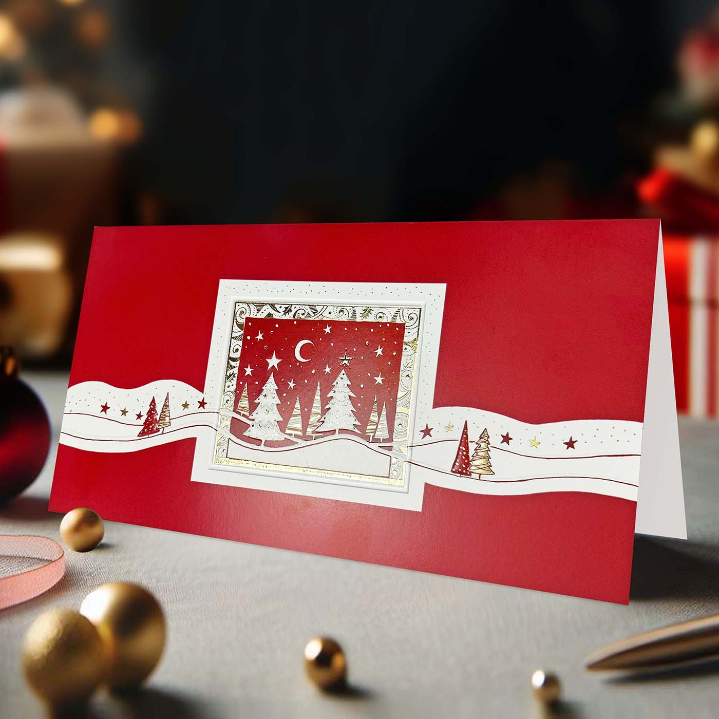 Karácsonyi képeslap piros-fehér-arany karácsonyi mintával.