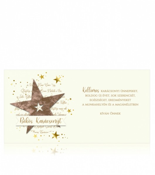 Egylapos karácsonyi képeslap  lézerrel vágott barna csillag dísz kiegészítővel, amely kivehető.