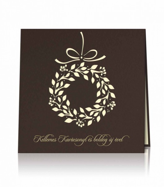 Karácsonyi képeslap barna színű kreatív papírból, lézerrel vágott karácsonyi koszorú mintával, amin átlátszódik a krém színű betétlap.