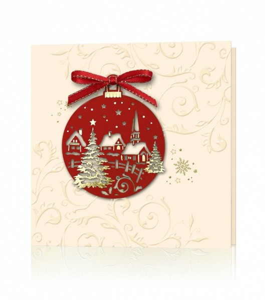 Krém színű kreatív papírból készült, kinyitható karácsonyi képeslap, elején lézerrel vágott, mintás gömb karácsonyfa dísz dekorálással.